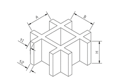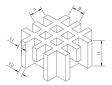 | 序号 | 方格类别 | 高度(mm) | 方格尺寸 A×B(mm) | 肋厚 t1×t2(mm) | 整版尺寸(mm) | 空隙率(%) | 理论重量(Kg/m²) | 图示 |